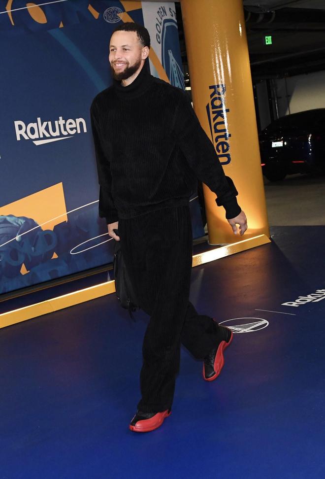 赛前,勇士球星斯蒂芬-库里上脚迈克尔-乔丹在1997年总决赛G5中“流感之战”配色的Air Jordan 12球鞋入场。